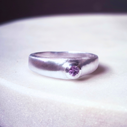 We love the bright pop of the Pink sapphire and the weighty feel of this beautifully hand crafted pendant.