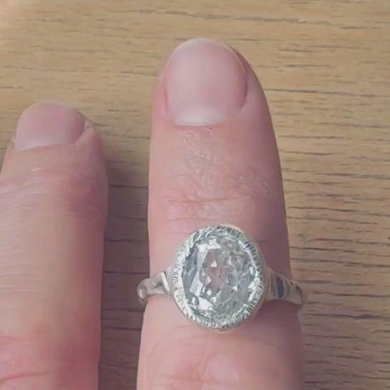 Finding beauty in contrast. This one-of-a-kind, handsculpted ring features a brilliant oval white sapphire set against the sophisticated matte finish of oxidized sterling silver. The ring is intricately textured, creating a time-worn aesthetic that perfectly contrasts the stone's shine. It is a striking, darkly glamorous statement embodying both grit and glamour.